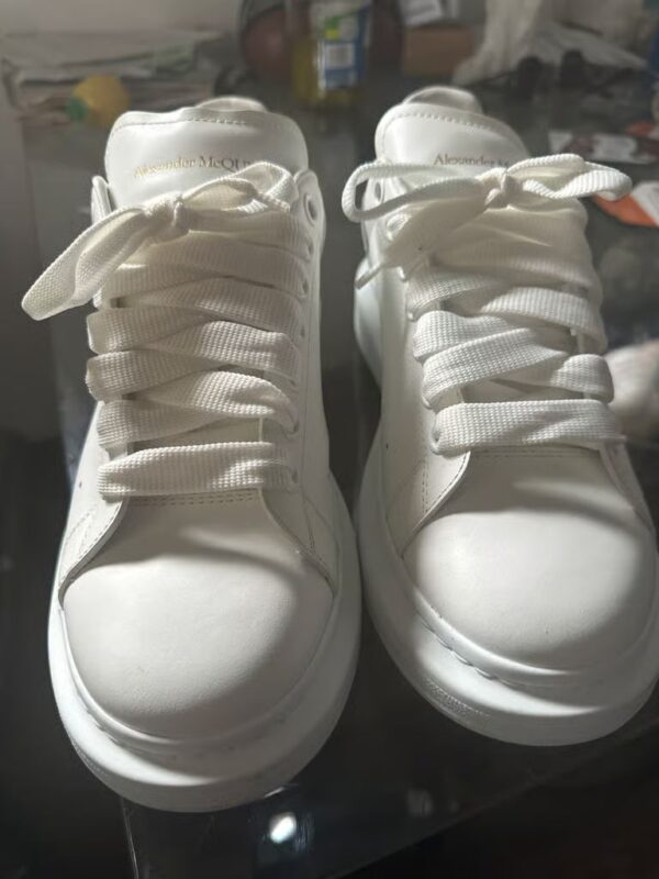 The Alexander McQueen Oversized 'White' sneaker is a striking blend of contemporary style and classic design. Featuring a sleek leather upper, the shoe showcases a minimalist aesthetic that is both bold and refined. Its oversized rubber sole adds a distinct touch, elevating the overall silhouette while providing exceptional comfort. The subtle branding and meticulous craftsmanship highlight McQueen's dedication to quality, making these sneakers a versatile addition to any wardrobe. Perfect for casual outings or adding a chic twist to a more polished look, the Oversized 'White' exemplifies modern luxury.