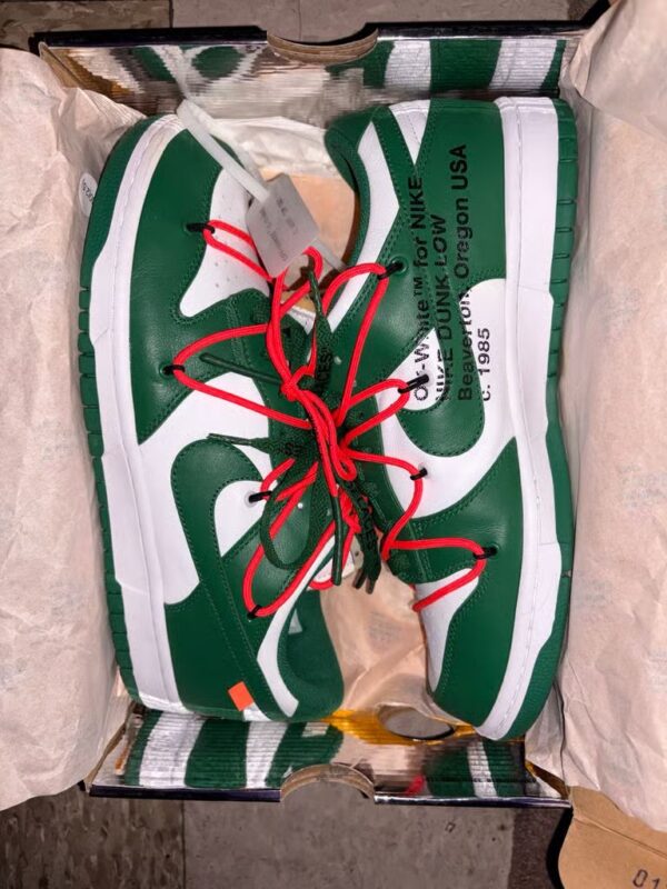 The Off-White x Nike Dunk Low 'Pine Green' is a striking fusion of streetwear and high fashion that captures attention with its bold color palette. The sneaker features a deep green upper made from premium materials, accented by Off-White's signature deconstructed elements, including exposed stitching and unique branding. Black overlays and laces provide a striking contrast, while the signature zip tie adds an unmistakable touch of Off-White's avant-garde style. The translucent outsole and padded collar ensure both comfort and functionality. This collaboration not only pays homage to the classic Dunk silhouette but also redefines it, making it a coveted piece for sneaker lovers and fashion enthusiasts alike.